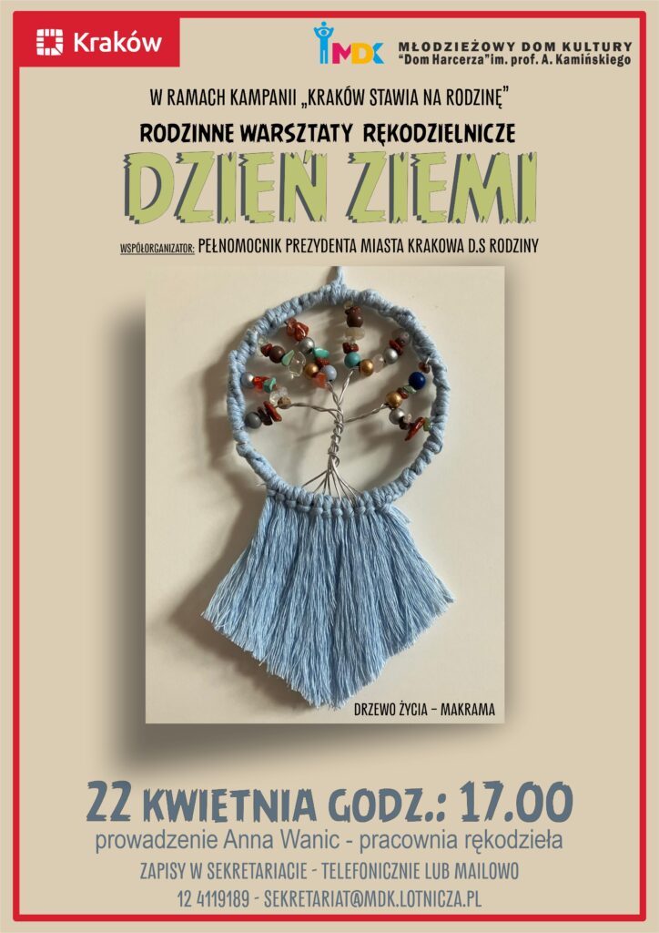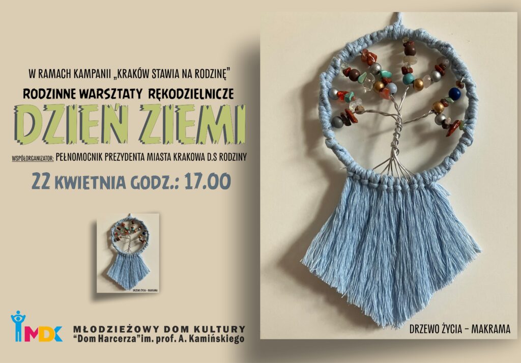Młodzieżowy Dom Kultury „Dom Harcerza” im. prof. A. Kamińskiego w Krakowie i Pełnomocnik Miasta Krakowa d.s. Rodziny serdecznie zapraszają na wyjątkowe Rodzinne Warsztaty „Dzień Ziemi”